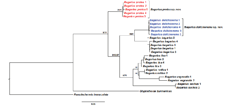 基于细胞色素c氧化酶亚基ICOI)基因序列构建的魾属物种系统发育结果强烈支持原魾与长丝魾的有效性。原魾位于魾属系统发育树的基部,而长丝魾则是魾B. bagarius的姐妹群。COI基因序列K2P模型估算的遗传距离显示,原魾与其他魾属物种之间的遗传距离范围为8.0%12.6%,长丝魾与其他魾属物种之间的遗传距离范围为5.7%12.1%。