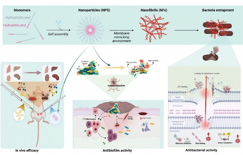 近日,针对抗菌耐药性(AMR)这一全球性健康难题,中国科学院昆明动物研究所赖仞研究员领衔的研究团队,成功设计并验证了一种名为SAP2-PEG的新型自组装抗菌肽,它能高效清除多重耐药菌。SAP2-PEG可通过直接膜破坏以及抑制群体感应多重作用作用来对抗生物膜相关感染,对伤口和导管相关感染的多微生物生物膜均有效。在体内,它显著减少了铜绿假单胞菌肺部和金黄色葡萄球菌的全身感染。这些研究结果表明SAP2-PEG是一种有希望的治疗候选药物。