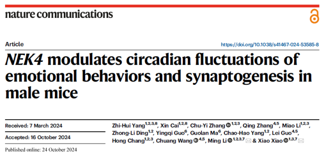 双相障碍的核心临床特征为情绪在抑郁与躁狂状态间反复波动,然而现有动物模型——无论是基于遗传操作还是环境干预——均难以有效模拟这种情绪转换过程,极大制约了对其发病机制的深入解析。中国科学院昆明动物研究所肖潇团队基于双相障碍患者的GWAS数据及脑组织转录组数据分析,发现海马区NEK4表达上升可能是疾病发生的重要风险因素。研究团队分别通过腺相关病毒介导的海马过表达以及H11-LSL-NEK4; CaMKIIα-Cre条件性过表达手段,在小鼠中验证了NEK4高表达可引发情绪行为的昼夜波动:白天表现为焦虑样行为,夜间则转为躁狂样行为,较好地模拟了患者情绪不稳定的核心症状。进一步借助神经元稀疏标记和透射电镜技术,发现NEK4过表达干扰了树突棘形态发生和突触结构昼夜节律的正常波动,提示“突触内部时钟”紊乱可能参与情绪波动行为的发生。值得注意的是,锂盐(经典心境稳定剂)可有效改善NEK4过表达引发的行为与突触结构异常。该研究首次揭示NEK4在脑内表达调控可模拟双相障碍关键临床症状,并提出“突触稳态失衡”可能是情绪波动的重要生物学基础。相关结果发表于《Nature Communications》,文章标题为“NEK4 modulates circadian fluctuations of emotional behaviors and synaptogenesis in male mice”,并获国家发明专利授权(专利号:ZL202410603746.5)——“一种自发出现情绪异常波动的非人哺乳动物模型的构建方法及其用途”。