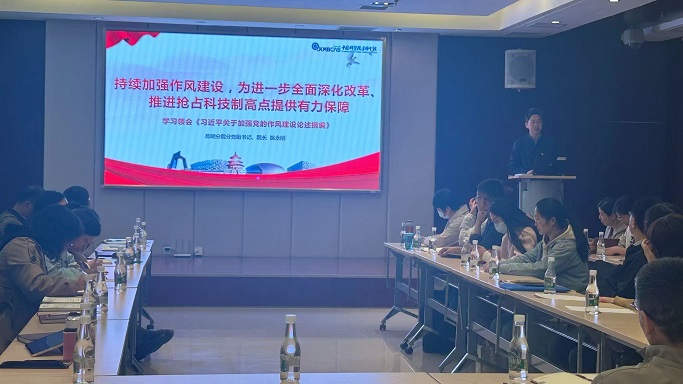 首先,姚永刚作了题为《持续加强作风建设,为进一步全面深化改革、推进抢占科技制高点提供有力保障》的专题党课,带领大家学习了《习近平关于加强党的作风建设论述摘编》相关内容。他指出,全体党员要持之以恒学习贯彻中央八项规定精神,要深刻领会加强党的作风建设的重大意义、本质属性和核心要义;牢牢抓住加强党的作风建设的重大举措、重点任务和“关键少数”;要深入学习领会习近平总书记关于作风建设的重要论述精神,把学习教育成果转化为推动全面工作、抢占科技制高点的强大动力。他以典型案例深入剖析违反中央八项规定精神及其实施细则的深层次原因,提醒大家不断增强党性修养,提高对于自身的要求。他进一步强调,要以此次专题学习为契机,大力弘扬党的优良传统和作风,以更加昂扬饱满的精神状态和更加务实的工作作风,在实现科技自立自强的新征程中展现新作为、做出新贡献。
